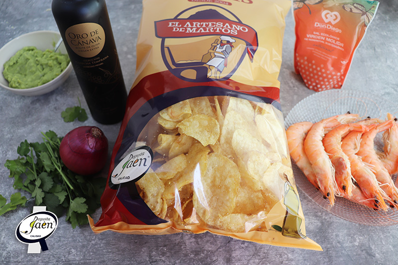 Además los hemos hecho con productos que cuentan con la marca Degusta Jaén Calidad, un distintivo a nivel nacional y europeo que certifica al consumidor que tiene entre sus manos un producto elaborado en la provincia de Jaén, de una calidad excelente, en este caso Aceite de oliva virgen extra Oro de Cánava, Sal de Salinas Don Diego, Langostinos cocidos de Mariscos Castellar y Patatas fritas de El Artesano de Martos.