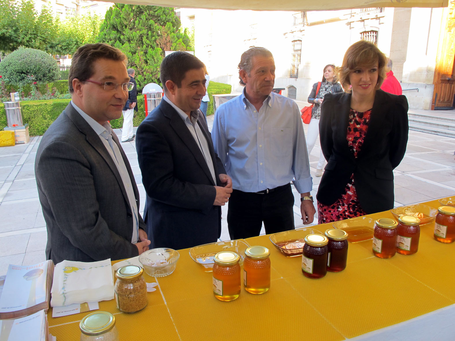 La lonja del Palacio Provincial ha acogido hoy el inicio de la Muestra Provincial de la Miel, una actividad organizada por la Diputación en el marco de la estrategia Degusta Jaén. El presidente de la Administración provincial, Francisco Reyes, acompañado por la diputada de Agricultura, Ganadería y Medio Ambiente, María Angustias Velasco, y el diputado provincial Francisco Huertas, ha inaugurado esta muestra junto a Manuel García, presidente de la Asociación Provincial de Apicultores de Jaén (APAJ), entidad colaboradora en esta iniciativa. La miel se suma así a otros productos que ya han centrado estas muestras del Degusta Jaén, como la cereza de Torres y Castillo de Locubín, la breva de Jimena, el melocotón de Huesa o la fresa de Valdepeñas de Jaén; productos cuya elaboración representa “la calidad, el esfuerzo y cercanía a la ciudadanía”, ha subrayado Reyes, que ha señalado la miel como ejemplo de producción realizada con “mimo y tradición”.