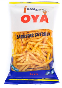 Aperitivo elaborado con Harina y fécula de patata (70%), aceite de girasol alto oleico, aroma con sabor a ketchup, dextrosa, sal, potenciadores del sabor (E-621, E-635), tomate en polvo, azúcar, cebolla en polvo, pimentón, antioxidante (E-300), colorantes (E-160b, E-160c) y estabilizante (E-414)