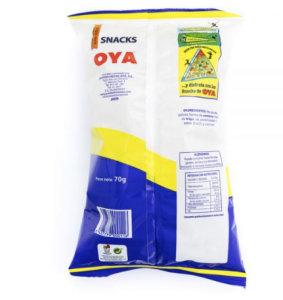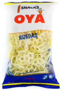 Aperitivo frito elaborado con Fécula de patata, harina de CENTENO, harina de TRIGO, sal, potenciador del sabor (E-621) y cúrcuma.