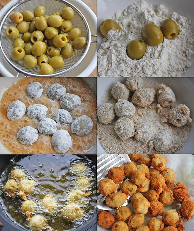 Ponemos las aceitunas en un escurridos para que suelten todo el líquido, también podéis secarlas con papel de cocina, una vez secas las pasamos por harina, después por huevo batido y por último por pan rallado. Una vez rebozadas las freímos en aceite de oliva virgen extra hasta que estén doradas. Servimos inmediatamente.