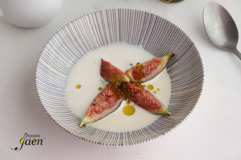El Ajoblanco hecho con harina de habas secas es un plato tradicional de la Cocina de Jaén y de otros puntos de Andalucía, se toma como sopa fría durante el verano, combina a la perfección con el sabor dulce de las Brevas, además lo vamos a rematar con unas perlas de aove, un plato de lujo con el que disfrutar en la mesa de los excelentes productos agroalimentarios que se elaboran en la provincia de Jaén y que dada su calidad cuentan con el distintivo Degusta Jaén Calidad.