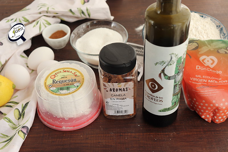 Os proponemos preparar un bizcocho casero hecho con requesón de cabra de Quesos Sierra Sur de Ermita Nueva en Alcalá la Real, aceite de oliva virgen extra cosecha temprana de la variedad frantoio de Guardián de los Trofeos de Vilches, y un toque de canela molida de Aromas de Jaén de Andújar, todos son productos que cuentan con el distintivo Degusta Jaén Calidad, es decir, una marca a nivel nacional y europeo que certifica al consumidor que está ante un producto de excelente calidad elaborado en la provincia de Jaén.