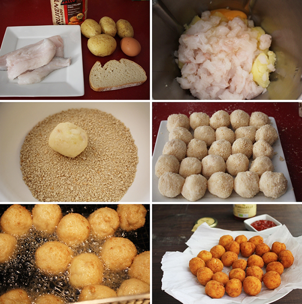 Cocemos las patatas, nosotros las cocemos en el microondas, pinchando varias veces la piel y las metemos unos 8 minutos a máxima potencia, una vez cocidas las pelamos y las chafamos, añadimos la merluza limpia y picada finamente, el huevo, un poco de sal y de pimienta y el pan o miga de pan, los mezclamos todo muy bien. Si tenéis robot de cocina tipo Thermomix ponéis todos los ingredientes en el vaso y mezcláis unos 10 segundos en velocidad 4. Una vez que tenemos la masa lista formamos bolitas, de bocado, las rebozamos en pan rallado y las freímos en aceite de oliva virgen o virgen extra hasta que estén doradas.