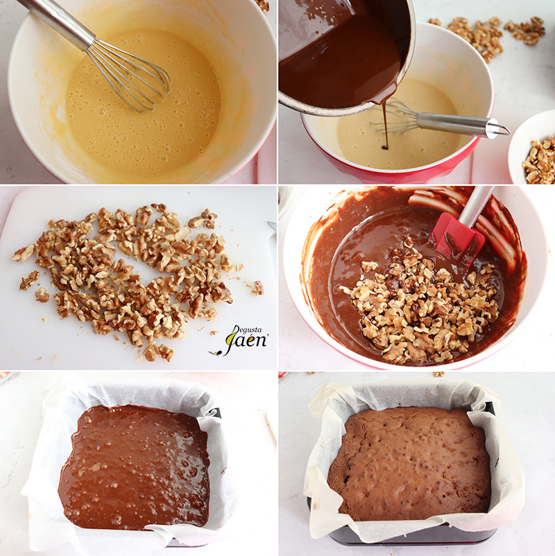 Batimos los huevos con el azúcar con unas varillas, incorporamos el chocolate que hemos fundido al baño maría y mezclado con el aceite de oliva virgen extra, añadimos la harina y un pellizco de sal, por último incorporamos las nueces que hemos picado groseramente. Mezclamos todo, ponemos en un molde cuadrado y horneamos 20 minutos a 180º C.