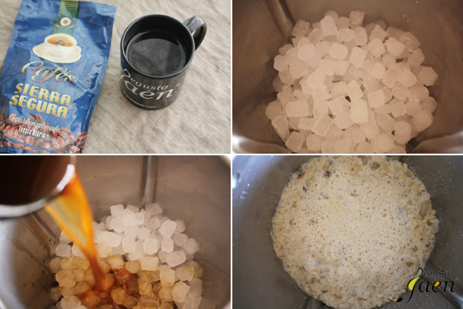 Lo primero es hacer un café, lo hemos hecho descafeinado, de Cafés Sierra Segura. Ponemos hielo en el vaso de la batidora o robot, añadimos el café ya frío, que podéis endulzar al gusto. Trituramos todo a máxima velocidad.