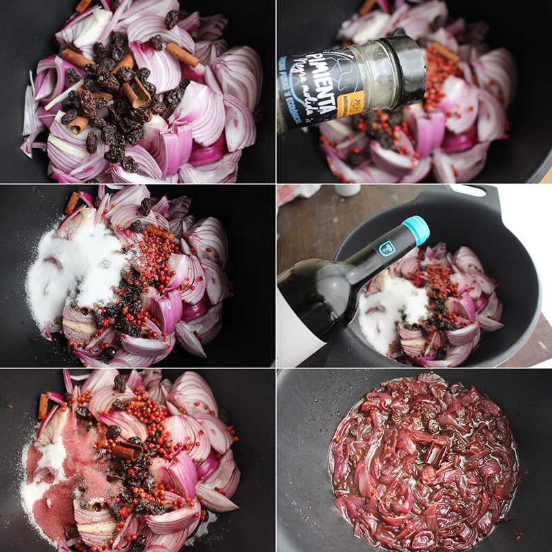 Pelamos la cebolla roja, la cortamos y ponemos en una cazuela con las pasas, la canela, la pimienta negra, la sal, la pimienta rosa, el azúcar, el vinagre de vino tinto, el aceite de oliva virgen extra y el vino tinto. Ponemos al fuego, cuando comience a hervir, bajamos el fuego y dejamos que se cocine a fuego suave unos 30 minutos.
