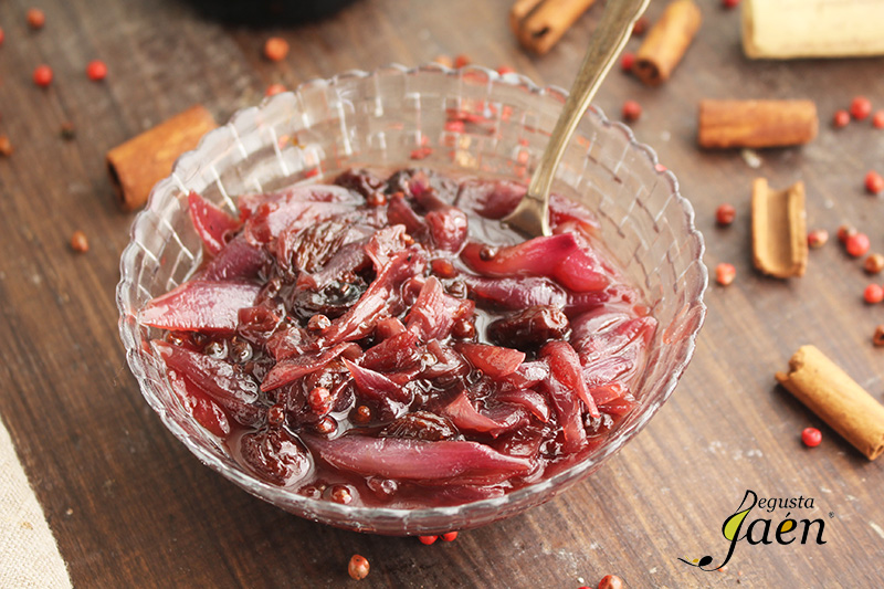 El chutney de cebolla roja es como una mermelada especiada que en este caso hemos hecho con vino tinto, un vino de Bodegas Campoameno de que cuenta con el distintivo Degusta Jaén Calidad etiqueta negra, una marca a nivel nacional y europeo que indica al consumidor que está ante un producto de excelente calidad elaborado en la provincia de Jaén.