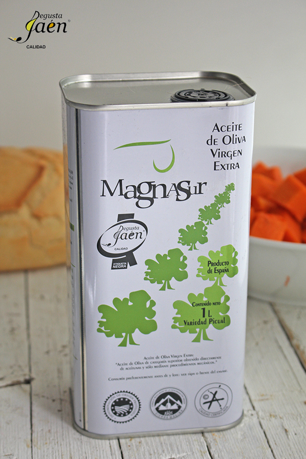 Hemos utilizado para elaborar tanto la crema como los picatostes un aceite de oliva virgen extra que cuenta con el distintivo Degusta Jaén Calidad, etiqueta negra y que es elaborado en Aceites Andaluces Sierra Mágina, Magnasur. En esta empresa ubicada en Bedmar, en pleno Parque Natural de Sierra Mágina, participan varias cooperativas, se trata de un aceite de oliva virgen extra elaborado con la variedad de aceituna picual 100% . Forma parte de la Denominación de Origen "Sierra Mágina" y es un aceite procedente de Agricultura de Producción Integrada.