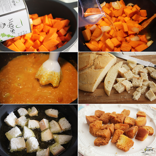 Hoy os traemos una receta de Crema de calabaza porque parece que el frío ha llegado de golpe y apetecen cosas calientes y de cuchara como esta deliciosa crema a la que le vamos a añadir unos tostones o picatostes fritos en aceite de oliva virgen extra que la harán aún más deliciosa.
