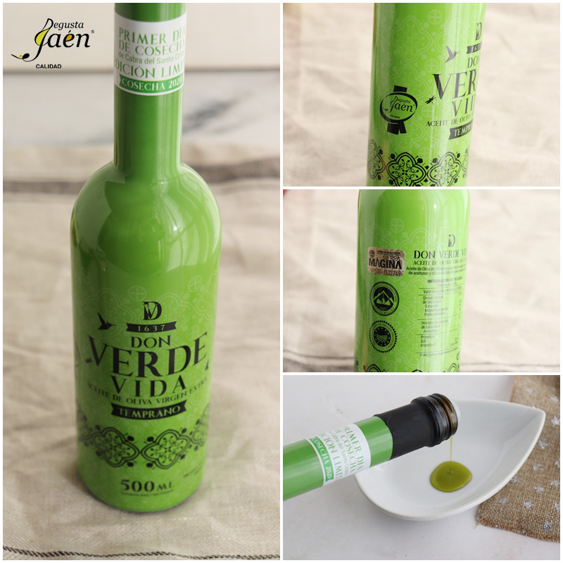 No hemos podido evitar añadirle una gota de nuestro maravilloso aceite de oliva virgen extra de cosecha temprana para terminar el plato, en esta ocasión hemos seleccionado un picual primer día de cosecha Don Verde Vida, un nuevo aceite elaborado por la Sociedad Cooperativa Andaluza La Unión del Santo Cristo, del municipio jiennense de Cabra del Santo Cristo. Se trata de un aceite procedente de aceitunas recolectadas en torno al 15 de octubre, muy frutado y de un aroma y color muy intensos, con un amargo y un picante muy equilibrado.