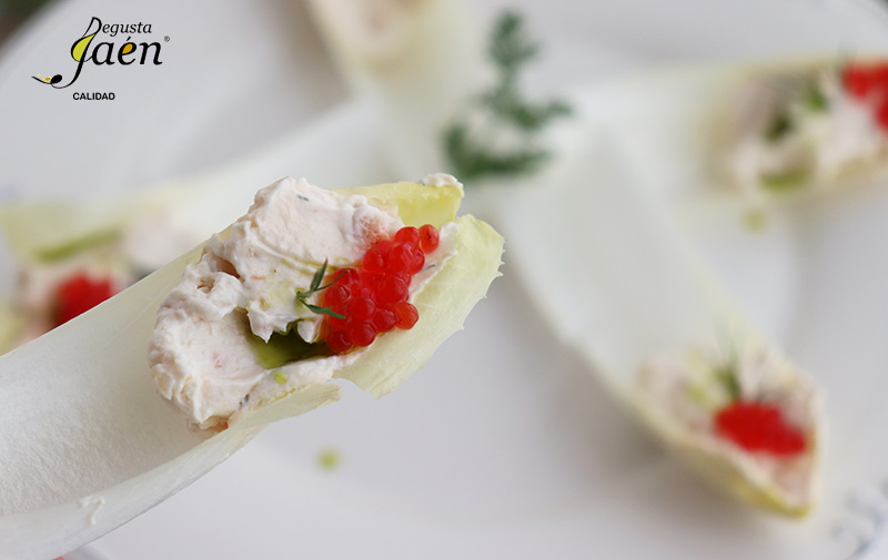 Endivias con cremoso de salmón y "aove", un aperitivo muy fácil de hacer con todo el sabor Degusta Jaén con el que vais a triunfar y disfrutar estos días festivos.