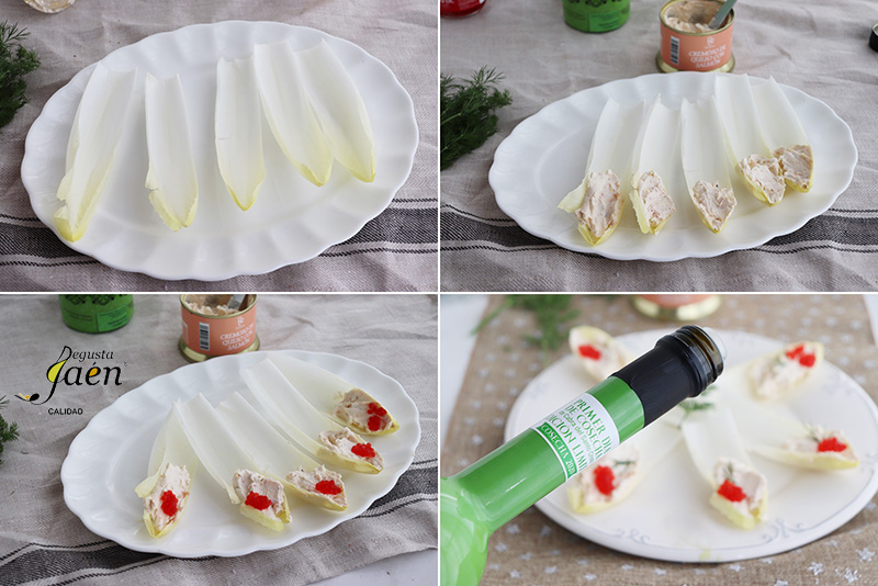 Ya sólo servir y disfrutar de este aperitivo de Endivias con Cremoso de salmón y aceite de oliva virgen extra lleno de sabor Degusta Jaén.