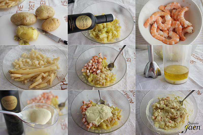 Receta de Ensaladilla de patata con espárragos, langostinos y lactonesa de "aove" Degusta Jaén.
