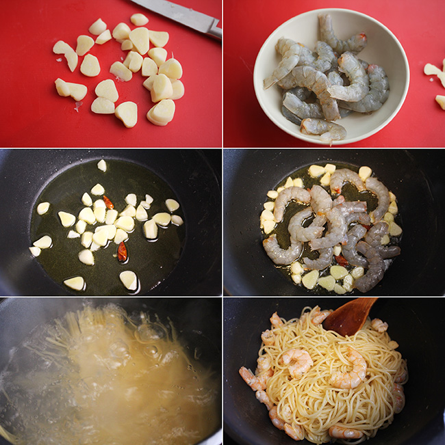 Cocemos la pasta. Pelamos los ajos y los fileteamos, los ponemos en la sartén con aceite de oliva virgen extra y las cayenas, cuando comiencen a dorarse añadimos los langostinos pelados.