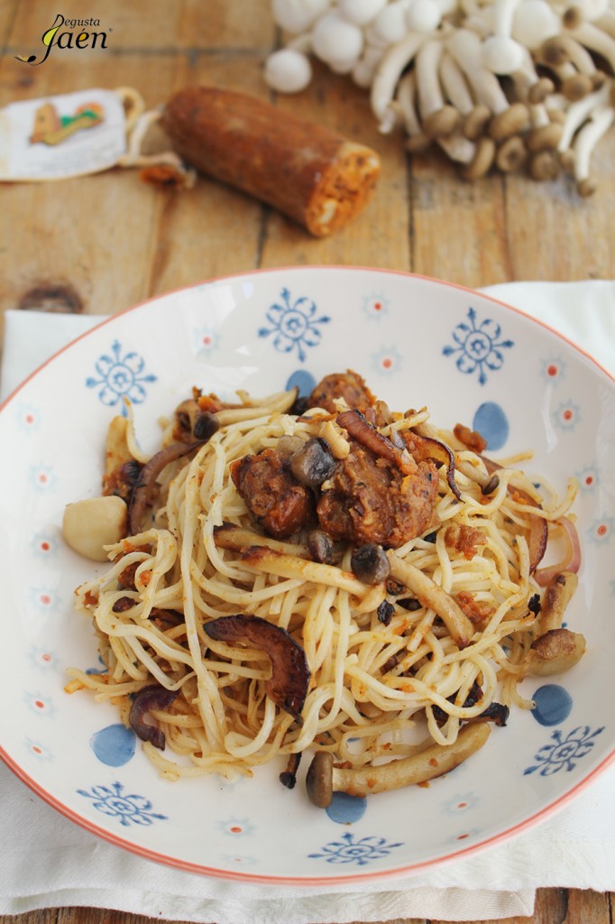 Fideos chinos con setas y morcilla sin sangre