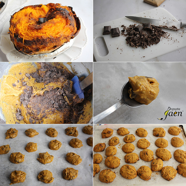 Pesamos la calabaza, la trituramos con la batidora y mezclamos con el resto de ingredientes, por último añadimos el chocolate que picamos con un cuchillo en trozos pequeños. Con la ayuda de dos cucharas vamos poniendo pequeños montoncitos en una bandeja de horno con papel de cocina. Horneamos a 180º C unos 20 minutos.