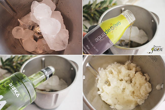 Ponemos en un robot de cocina o en un vaso americano el hielo, añadimos un botellín de agua de olivo y licor de manzana sin alcohol al gusto. Trituramos todo a máxima potencia y servimos de inmediato.