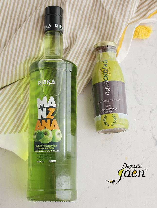 Nosotros vamos a tomar hoy el Agua de olivo en granizado y le hemos añadido un toque de licor de manzana sin alcohol elaborado con manzanas Golden bien maduras y sin una gota de alcohol. Listo para tomar como chupito o bien diluido en agua. De sabor suave con un punto justo de acidez, en Andújar por la empresa familiar Licores Riska.