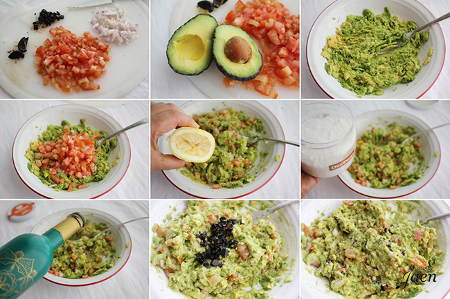 Picamos finamente la cebolla morada, el tomate y los ajos. Abrimos los aguacates y los trituramos con un tenedor, mezclamos todo, añadimos sal, unas gotas de limón y aceite de oliva virgen extra.