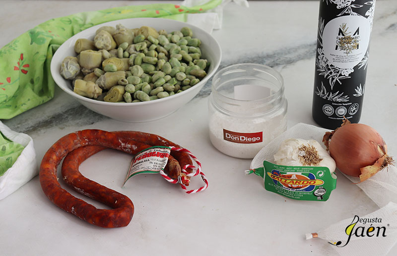 Para cocinar este rico plato hemos utilizado productos que cuentan con la marca Degusta Jaén Calidad, un distintivo a nivel nacional y europeo que indica al consumidor que está ante un producto de excelente calidad elaborado en la provincia de Jaén, así los ajos de Jamilena, de Ajos Gallardo; la sal de manantial de Jaén, de Salinas Don Diego; el aceite de oliva virgen extra picual de El Santuario de Mágina de Huelma y la chistorra picante de Embutidos Peñolite, de Peñolite en la Sierra de Segura.