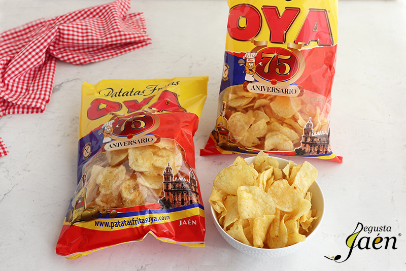 Hemos utilizado patatas fritas Oya, una empresa de Jaén que acaba de cumplir 75 años, y es que fue creada en el año 1945, en un barrio singular de Jaén, el de La Magdalena. Fue a comienzos de los años setenta trasladaron sus instalaciones al Polígono Industrial de Los Olivares, donde trabajan desde entonces para ofrecer sus productos en distintos formatos y así satisfacer las necesidades tanto de clientes particulares como del sector hostelería y la restauración. Actualmente es la tercera generación de los Oya la que se encarga de mantener vivos sus tradicionales productos.