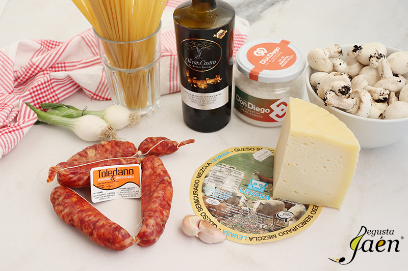 Hemos hecho un sofrito de cebolleta, ajos de Ajos Gallardo, champiñones y chorizo de Embutidos Toledano con sal de Salinas Don Diego y aceite de oliva virgen extra de Olivar de Castro, lo hemos mezclado con la pasta cocida y en la mesa le hemos rallado queso de Levasa, productos que han sido elaborados en la provincia de Jaén y que cuentan con la marca Degusta Jaén Calidad, una garantía de productos de excelente calidad.