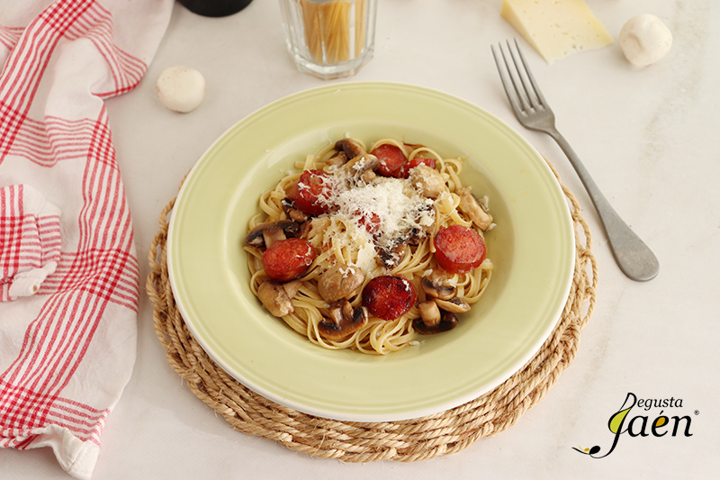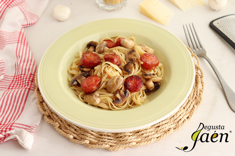 A continuación os explicamos cómo hacer Tallarines con champiñones, chorizo y queso, un delicioso plato con todo el sabor de Degusta Jaén.