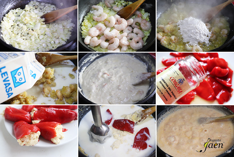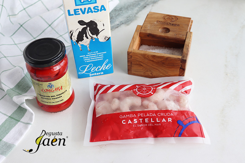 Además este plato tiene todo el sabor de Degusta Jaén ya que lo hemos elaborado con productos que tienen la marca Degusta Jaén Calidad, un distintivo a nivel nacional y europeo que reconoce la calidad de productos elaborados en la provincia de Jaén, así Pimientos del piquillo de Conservas Congana de Bedmar, Leche fresca entera Levasa de Jaén, Gambas peladas de Mariscos Castellar de Castellar y sal ecológica de manantial de Salinas Don Diego de Jaén.