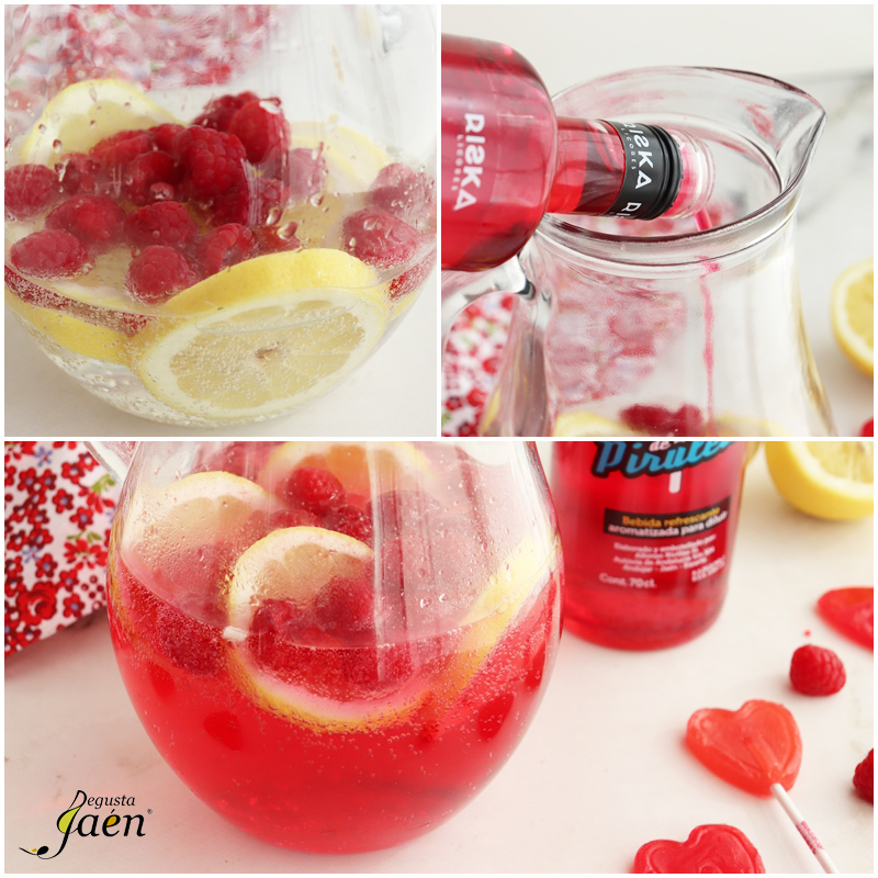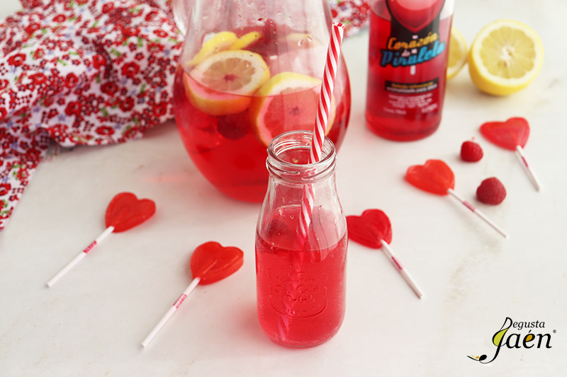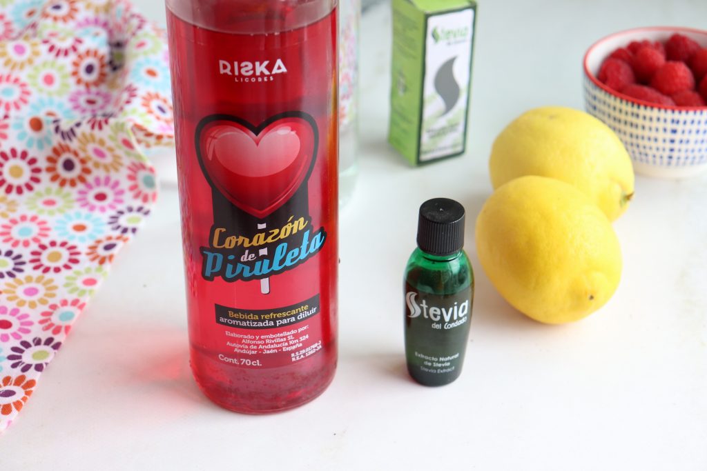 Refresco de licor de piruleta, una idea muy refrescante para disfrutar toda la familia estos días de verano, guardad bien la receta porque también es una bebida perfecta para cumpleaños y fiestas infantiles. Es facilísimo de preparar, tan sólo necesitamos Licor Corazón de piruleta, una bebida sin alcohol que elaboran en Licores Riska, una empresa familiar de Andújar. Le vamos a añadir limón, frambuesas o cerezas si estamos en época, y podéis ponerle refresco de lima limón si lo queréis con gas o bien agua y unas gotas de stevia natural de Stevia del Condado, de Navas de San Juan.