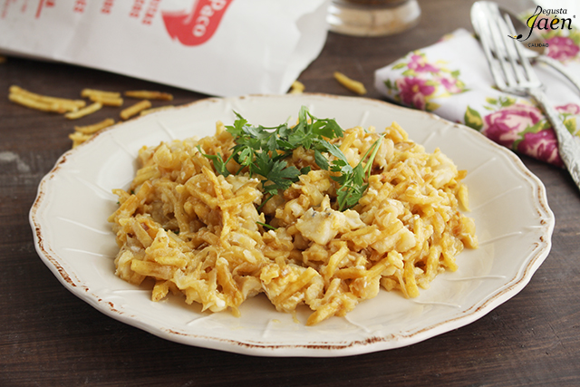 Revuelto de patatas paja con bacalao, un plato delicioso que se prepara en nada de tiempo ya que vamos a utilizar patatas paja ya preparadas, eso si patatas paja elaboradas en Jaén y es que hoy nos acercamos hasta uno de los comercios más tradicionales de Jaén como es Casa Paco, un establecimiento que cuenta con el distintivo Degusta Jaén Calidad, Etiqueta Oro, se reserva para los establecimientos de hostelería y comercio minorista de alimentación que utilizan productos de la marca “Degusta Jaén Calidad” en cualquiera de estas modalidades.