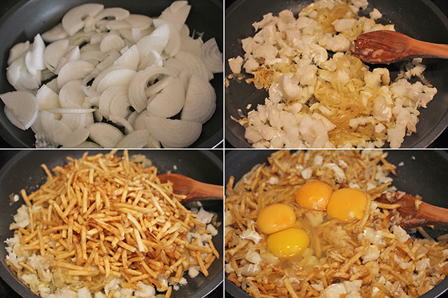 Cortamos las cebolletas en juliana fina y las cocinamos a fuego muy lento en la sartén con aceite de oliva virgen extra, cuando comiencen a dorarse añadimos las migas de bacalao desalado, mezclamos un par de minutos e incorporamos las patatas paja, mezclamos y por último añadimos los huevos, para que quede un revuelto muy jugoso apagaremos el fuego y cocinaremos el huevo con el calor residual. A la hora de servir podemos añadir un poco de perejil picado.