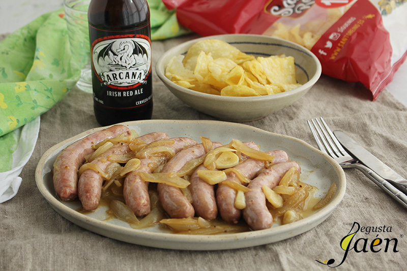 Hemos hecho este plato con Salchichas de Embutidos Ruano, una empresa familiar de Campillo de Arenas que lleva funcionando desde el año 1961, son salchichas frescas elaboradas con magro y panceta de cerdo con un sabor riquísimo. Las hemos cocinado con cerveza, una cerveza artesanal Irish red ale de Cervezas Arcana, esta se caracteriza por su color rubí y un acentuado sabor a malta, con toques de caramelo y regaliz. No contiene ni colorantes ni aditivos químicos.