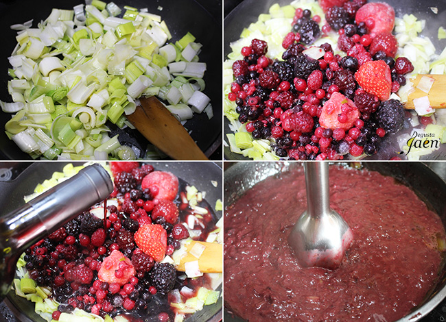 Mientras la carne está en el horno preparamos la salsa, para ello ponemos los puerros picados en la sartén con un poco de aceite de oliva virgen extra y sal, cocinamos a fuego muy suave, cuando estén añadimos los frutos rojos, el vino tinto y el azúcar, dejamos reducir. Incorporamos todo el jugo de la carne, trituramos y servimos junto con la carne. Además hemos hecho en el microondas unas patatas de guarnición y después las hemos salteado con aceite de oliva virgen extra, sal y pimienta.