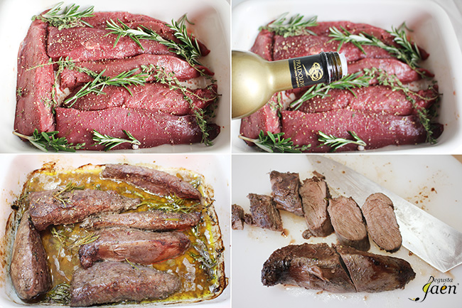 Podéis hacer el solomillo a la plancha o al horno como hemos hecho nosotros, lo salpimentamos, ponemos unas ramitas de romero y de tomillo, un poco de aceite de oliva virgen extra por encima y metemos en el horno precalentado a 200º C unos 15 minutos si lo queremos en su punto o 20 minutos si lo queremos más hecho.