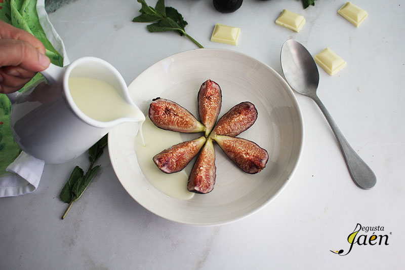 Cortamos las brevas, ponemos en un plato y servimos la crema fría, decoramos con unas hojas de hierbabuena.