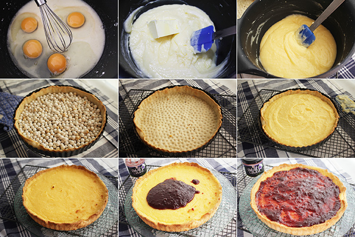 En un recipiente ponemos los huevos, el zumo de limón, el azúcar y la maizena diluida en leche, mezclamos bien hasta que esté todo integrado, ponemos al fuego muy suave, y comenzamos a mezclar con unas varillas hasta que la mezcla espese, apartamos del fuego, incorporamos la mantequilla, mezclamos y reservamos. Extendemos la masa quebrada en un molde desmontable, ponemos peso, por ejemplo unos garbanzos secos y metemos en el horno precalentado, a 180º C unos quince minutos, sacamos, quitamos el peso y ponemos la crema. Volvemos a meter en el horno, unos 20 minutos.