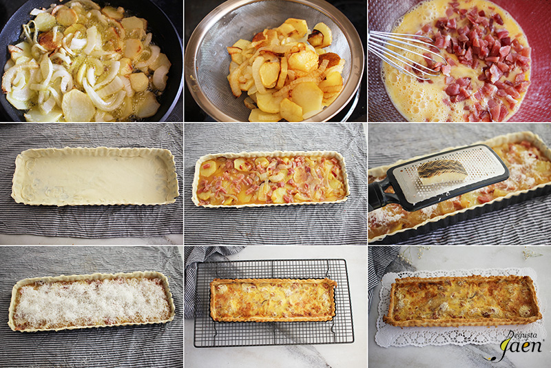 Pelamos las patatas y cortamos en rodajas al igual que la cebolla, freímos ambas cosas en aceite de oliva virgen extra variedad picual y un poco de sal. Cuando estén, colamos el aceite. Picamos el jamón serrano y lo mezclamos con los huevos y las patatas y cebolla. Extendemos la masa de hojaldre sobre el molde desmontable que elijamos, nosotros hemos optado por uno rectangular, vertemos la mezcla y rallamos queso por encima.