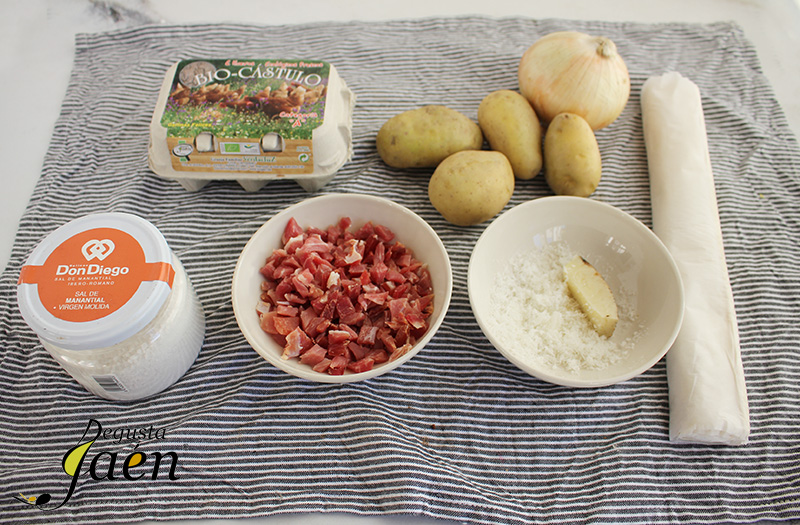 Como ingredientes principales hemos utilizado Huevos de gallinas felices de BioCástulo, una empresa familiar de Linares, Jamón serrano de Jamones El Gorrilla y Queso Jenabe semicurado de Quesería Cortijo La Vicaría, todos productos elaborados en la provincia de Jaén que cuentan con la marca Degusta Jaén Calidad, un distintivo a nivel nacional y europeo que certifica al consumidor que está ante un producto de excelente calidad.