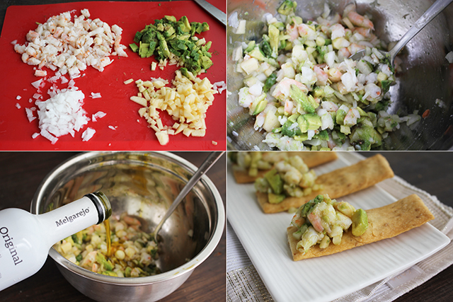 Una vez que las gambas están descongeladas las pelamos y las picamos con un cuchillo, el aguacate, la cebolleta y la manzana los picamos con un cuchillo finamente, ponemos todo en un recipiente, añadimos un poco de aceite de oliva virgen extra picual Melgarejo Original y servimos sobre una regañá o pan de olivo.