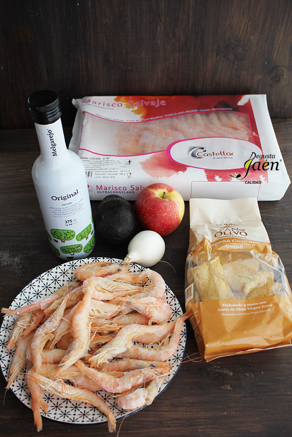A estas gambas le vamos a añadir un poco de manzana, de cebolleta y de aguacate, todo lo aderezaremos con aceite de oliva virgen extra de Melgarejo, una de las empresas más prestigiosas y conocidas de aceite de oliva virgen extra, una empresa familiar que comenzó su historia en 1870 y en la que ya son los tataranietos los que la dirigen. En esta ocasión hemos elegido Picual Original, un "aove" con un frutado medio de aceituna verde con tonos a hierba y tomate que es un viaje al corazón de Jaén.