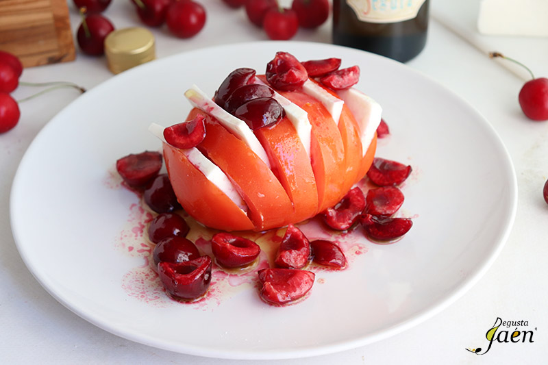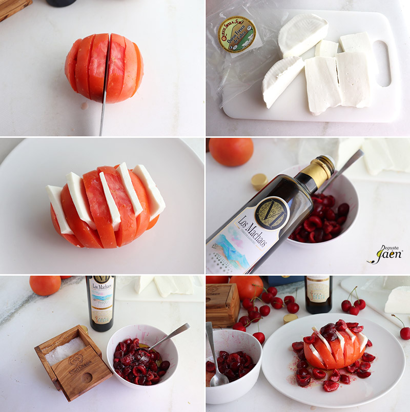 Lavamos los tomates, utilizaremos tomates rojos pero duros y grandes, les hacemos unos cortes sin llegar hasta el final, en cada raja introduciremos un trozo de queso, así de fácil. Acompañaremos con un aliño que haremos lavando y deshuesando las cerezas, un poco de sal y aceite de oliva virgen extra, lo mezclamos todo y servimos sobre los tomates.