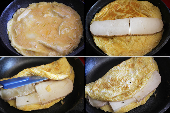 Batimos los huevos, ponemos un poco de aceite de oliva virgen extra en la sartén, vertemos los huevos, dejamos que se cuaje por un lado, le damos la vuelta, bajamos el fuego al mínimo, cubrimos la mitad con trozos de queso, doblamos la tortilla y cubrimos la parte del queso, cocinamos a fuego minímo hasta que el queso comience a  fundirse.