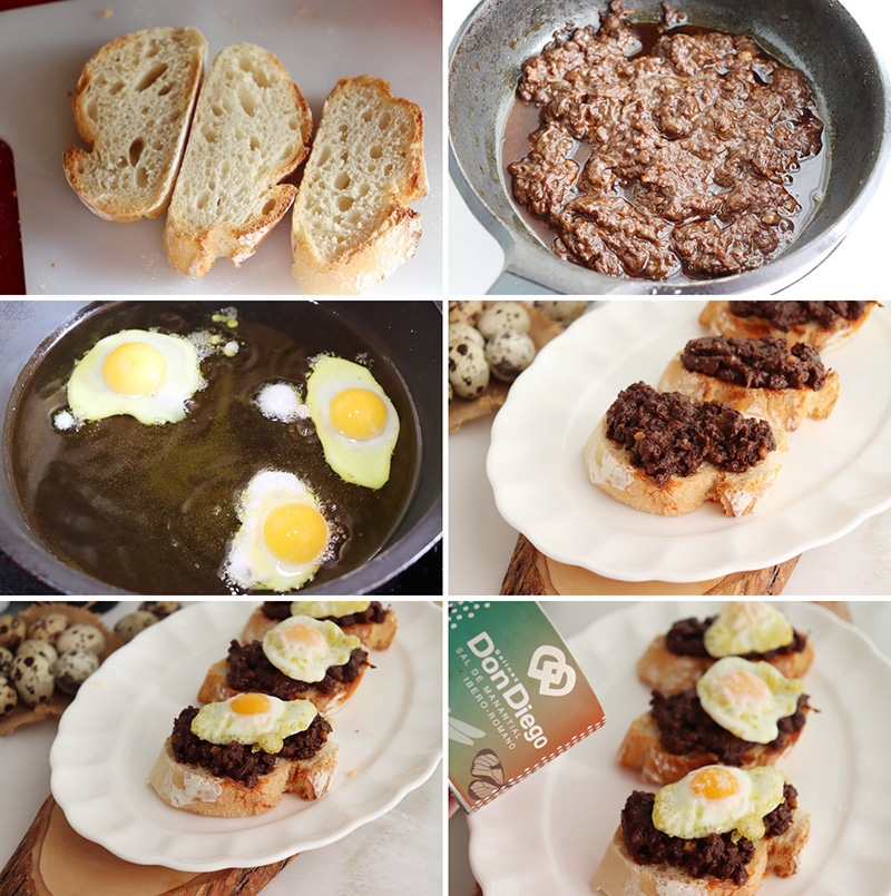 Servimos inmediatamente y ya sólo queda disfrutar de esta riquísima tapa de Tostas de morcilla en caldera con huevo de codorniz Degusta Jaén.