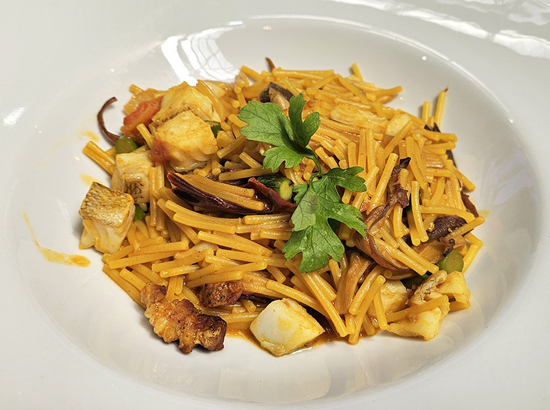 Fideos con bacalao, panceta y setas