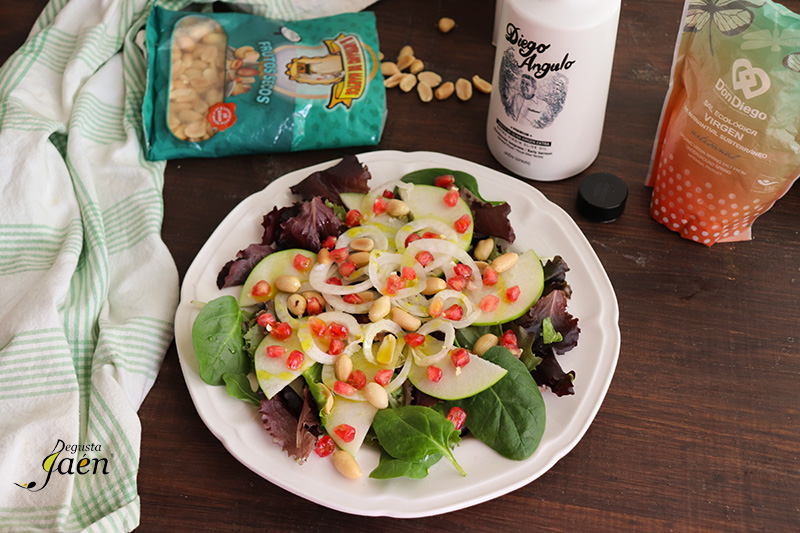 Ensalada de escarola, granada y queso de cabra con vinagreta de miel y aceite de oliva virgen extra